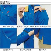 ストレッチ(伸長率20%) 吸汗・速乾 制電ケア設計 脇消臭テープ(DEONANO-V) 胸ペン挿し(左) レベルブック収納ポケット(右・深さ20cm) 袖マルチポケット(左) 裾スリット入り 袖口半リブ仕様 |