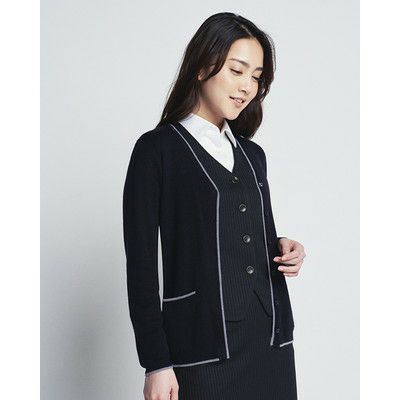 衿ぐりから前端、ポケット口に配したラインがアクセントになっているカーディガン。