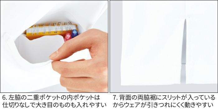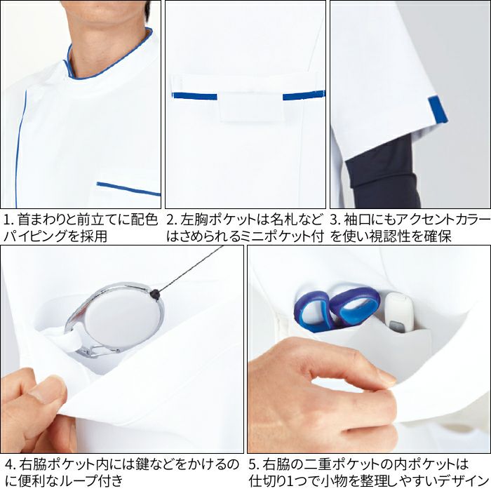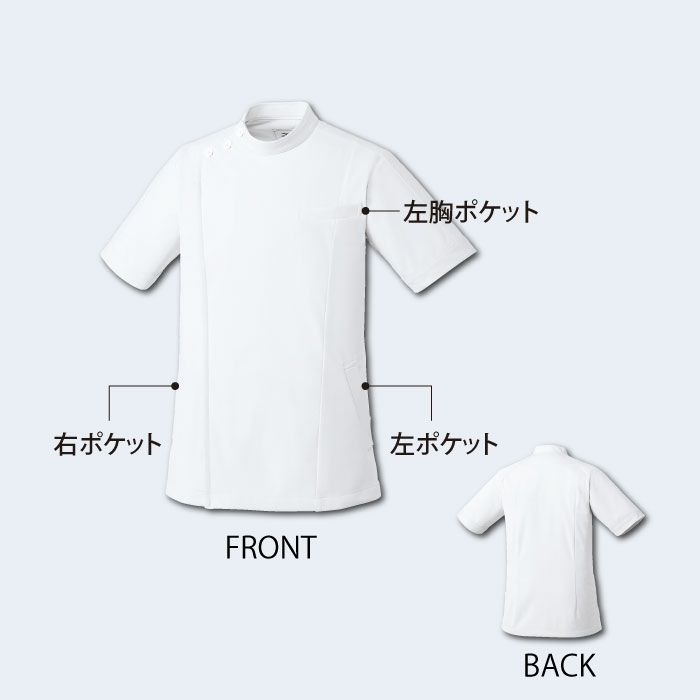 首元が詰まっているので前かがみになっても胸元の開きも気にならず、治療に専念しやすく、スクラブほどカジュアルにならずフォーマルな印象を与えることで人気です。理学療法士、作業療法士、歯科医、薬剤師、登録販売者に愛用者が多い白衣です。