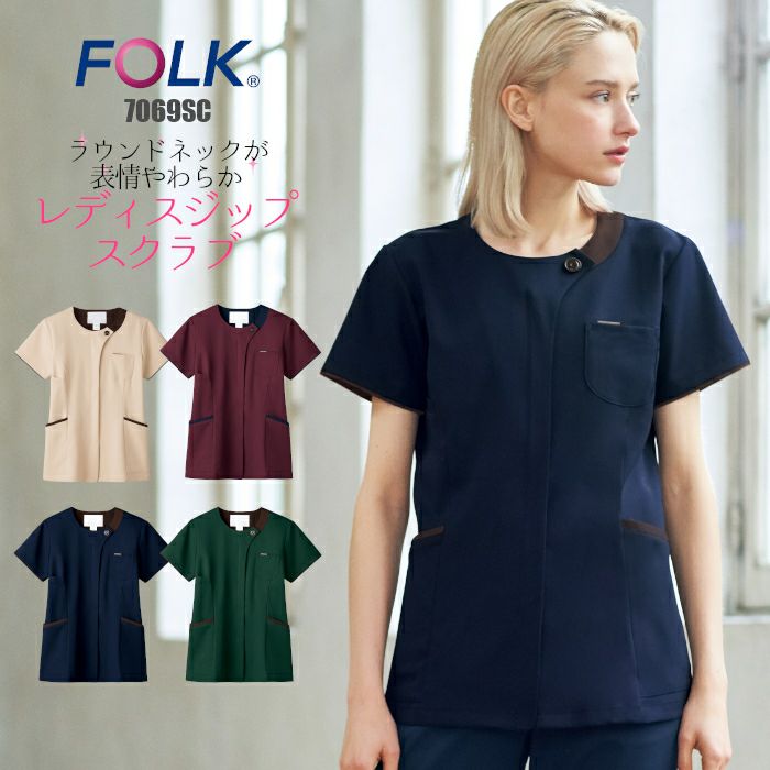 ラウンドカラーが上品なきれいめスクラブ スクラブ 医療用 レディース 白衣 7069C FOLK フォーク