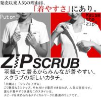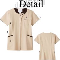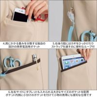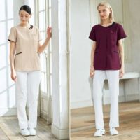 ラウンドカラーが表情を柔らかく見せるきれいめデザインのスクラブ。上品な配色や曲線を描くパターンは、ワンランク上のおもてなしスタイルにもぴったり。すっきり収納できる多機能ポケットやループ、携帯専用のポケットなど機能性も充実しています。
