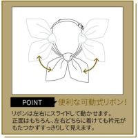 形成済みのスカーフ風のリボンで、襟元に飾るだけで装いをワンランクアップ。左右にスライドできるモチーフが着こなしの幅を広げます。