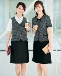 パール風のボタンがポイントで、親しみやすく着こなしやすいデザインです。