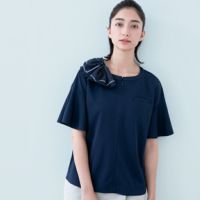 ノーカラーでオーバーブラウスのような着こなしができるポロシャツ。シンプルな形でジャパンメイドの高品質で美しい千鳥柄ニットが映えるデザインです。波うつようなラッフルスリーブで女性らしいしなやかさを演出。