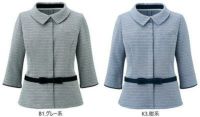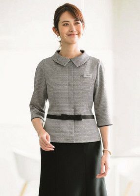 上品で可愛いウエストリボン付きのオーバーブラウス。シルバーラメ入りボーダー柄のサマーツイードで、リボンと袖口は光沢感のある濃色生地を使っています。袖は七分丈で折り返して着用すると丈調節でき、アクセントにもなります。前中心はスッキリとした比翼仕立て、左胸にはペン差しポケット(ネームホルダー付き)、両腰にはスマートフォンの入る実用的なポケットが付いています。左腰ポケットには小分け用インナーポケットも付いています。脇下裏側には消臭テープ、後衿ぐりにはレースの消臭テープが付いています。色はグレー系と紺系の2色展開、配色生地はそれぞれ黒、紺で、家庭洗濯可能です。