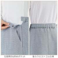 高品質な再生素材を使用した上品なデザインのオフィスウェア。春夏にぴったりの爽やかなツイード調のボーダー柄が好印象。オフィスをぱっと明るく彩ります。さらりとした肌触りが心地よく、手を入れやすい斜めポケットやウエスト後ろゴム仕様など、嬉しい機能が満載です。