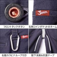 軽やかなストレッチドビーを使用した春夏にぴったりの作業服。ドットの織り柄が特徴的なストレッチ生地に赤と黒のアクセントカラーが効いた個性的なデザイン。目を引くブラック×レッドのコンビファスナーをあしらい、辛口の大人っぽいスタイルに。またカーゴポケットの他にカラビナループなどを付け、現場での使いやすさも抜群です。