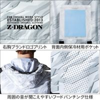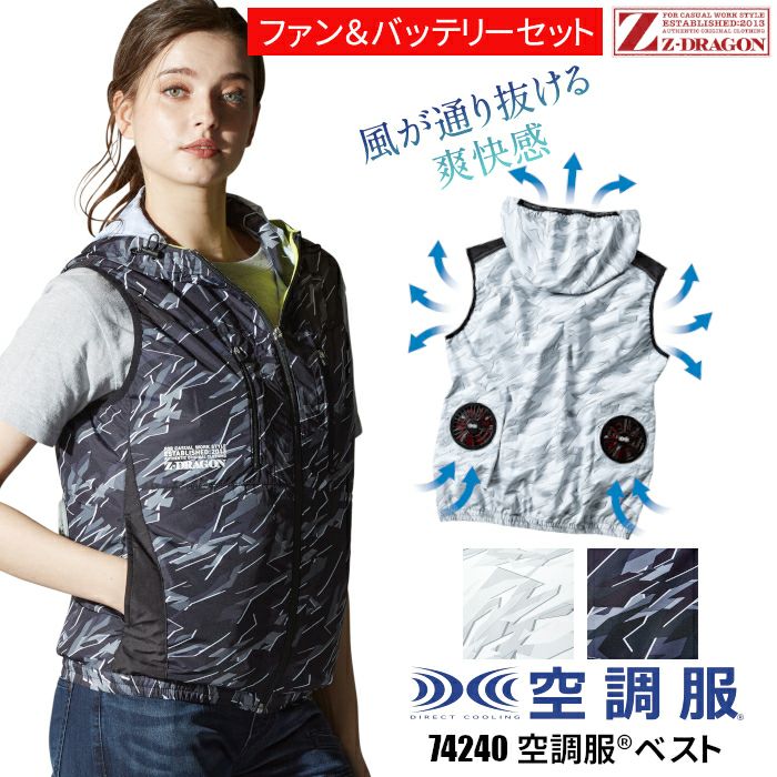 ロゴ入りのニットテープとプリント柄でスタイリッシュに着こなせる空調服です。