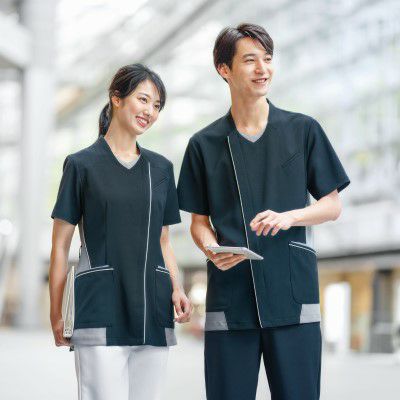 かがんでもチラ見えしにくいVネックの配色がポイント。