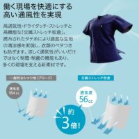 人気のミズノのスクラブの高通気シリーズ。チトセと小松マテーレが共同開発した新素材を採用し、一般的なシャツの約3倍もの通気量を誇るさわやかなウェアに仕立てました。のびやかなストレッチ性、さらりとした涼感素材に、制菌・制電性を付加し、様々なシーンで活躍するモデルです。